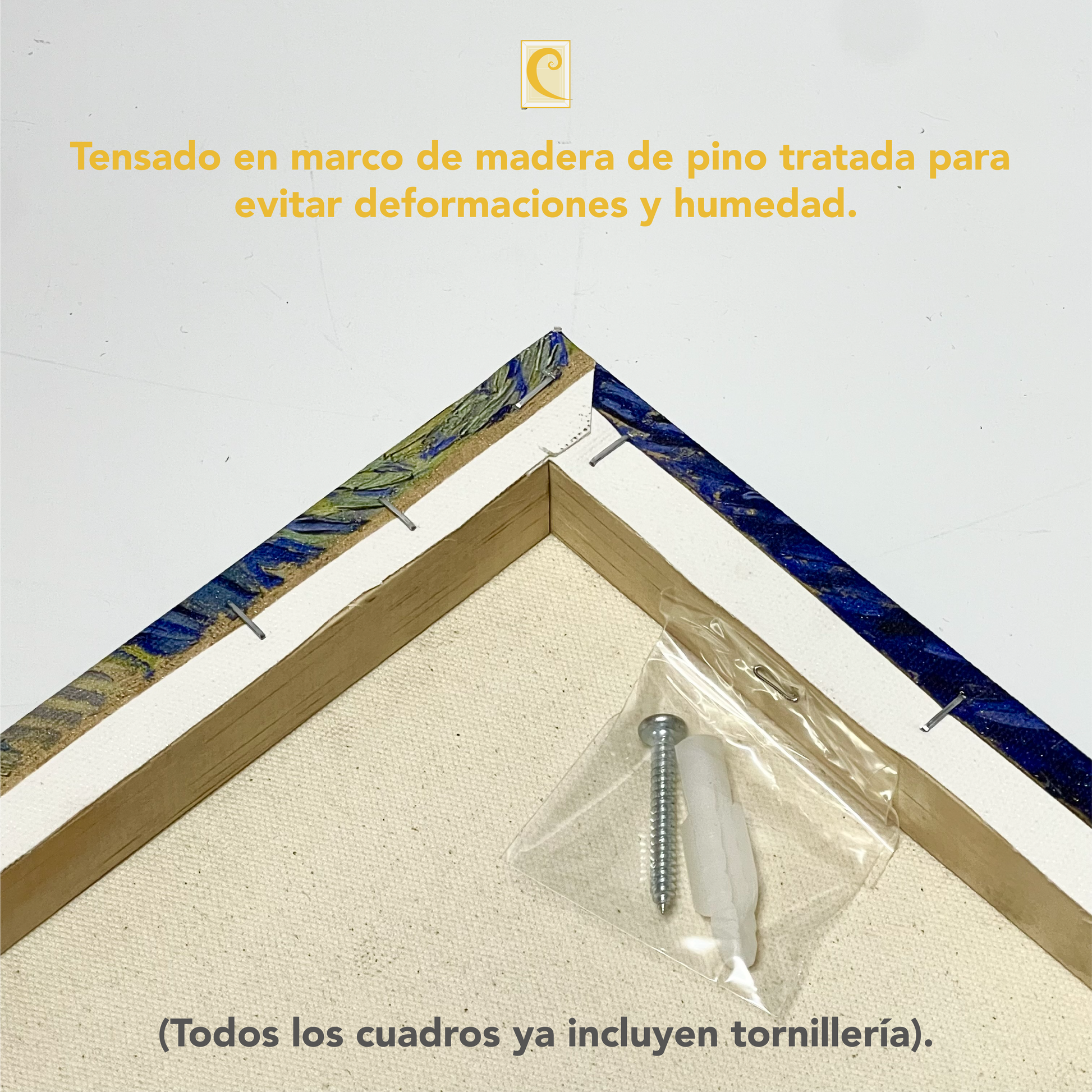 -Montado en bastidor de madera tratada para evitar deformaciones.